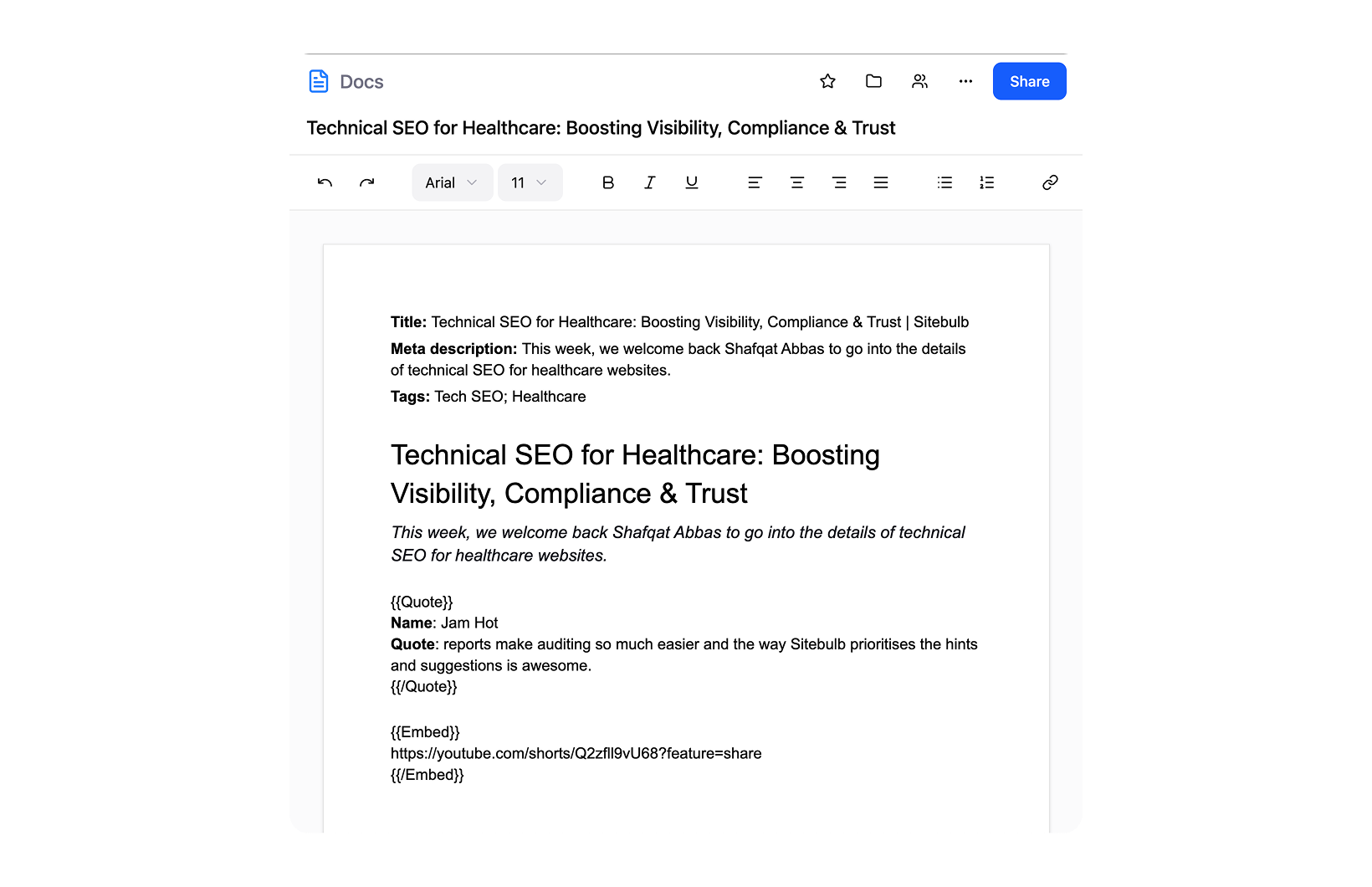 At Sitebulb, a significant portion of blog content was sourced from guest contributors who submitted drafts via Google Docs. Converting these raw documents into fully-published blog posts was a highly manual, time-consuming process. It involved: